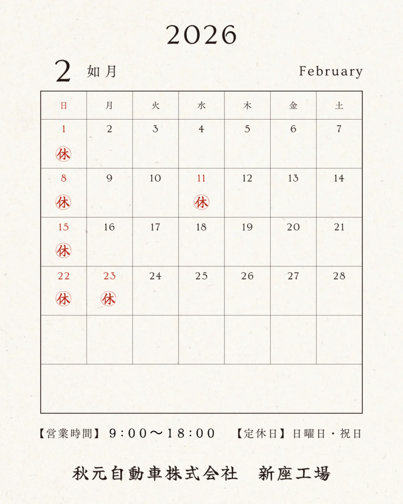 🚗 秋元自動車|2026年2月の営業日のお知らせ